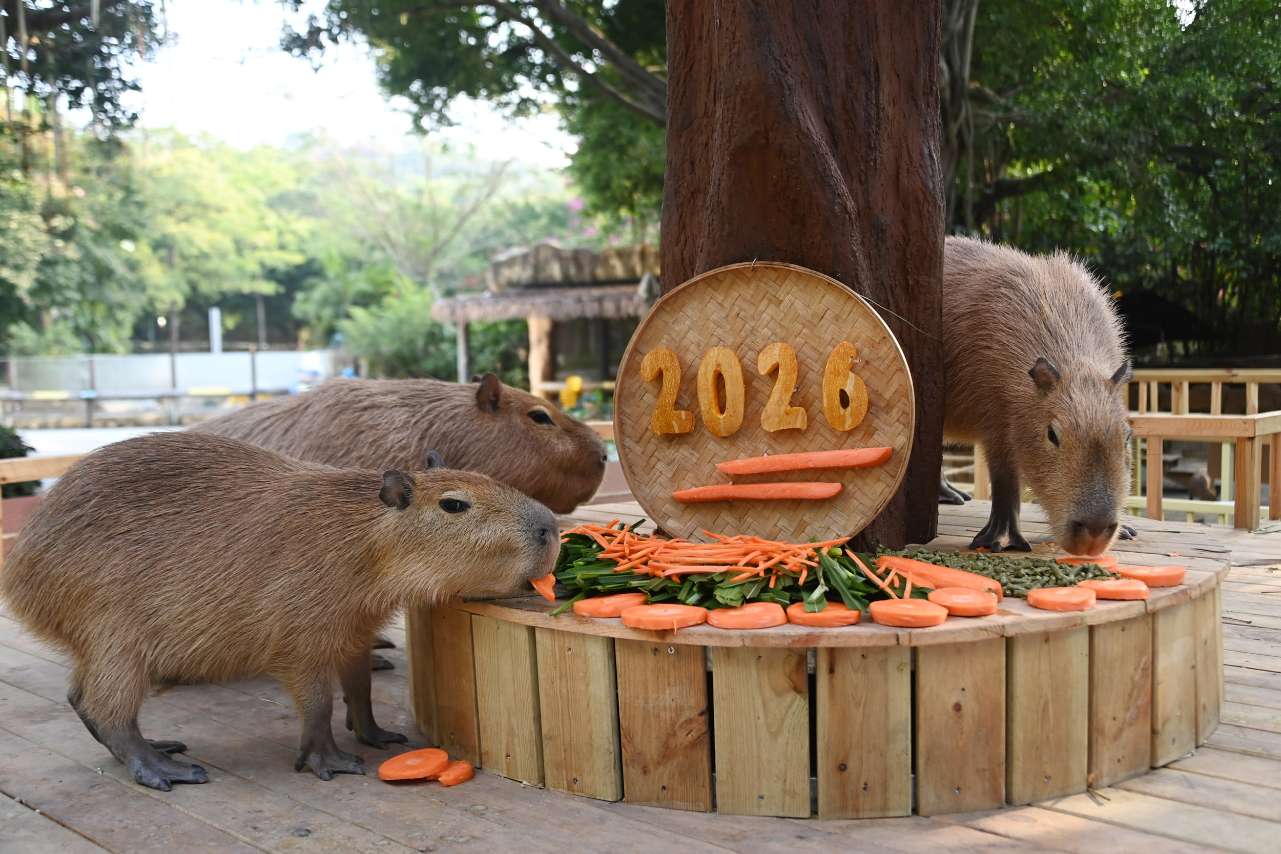 在新升级的水豚展区,工作人员依据水豚的饮食喜好,用南瓜、胡萝卜等制作出造型醒目的“2026”字样拼盘。多样的食物与独特的摆放既满足营养需求,也增添了进食乐趣,深受水豚家族欢迎。