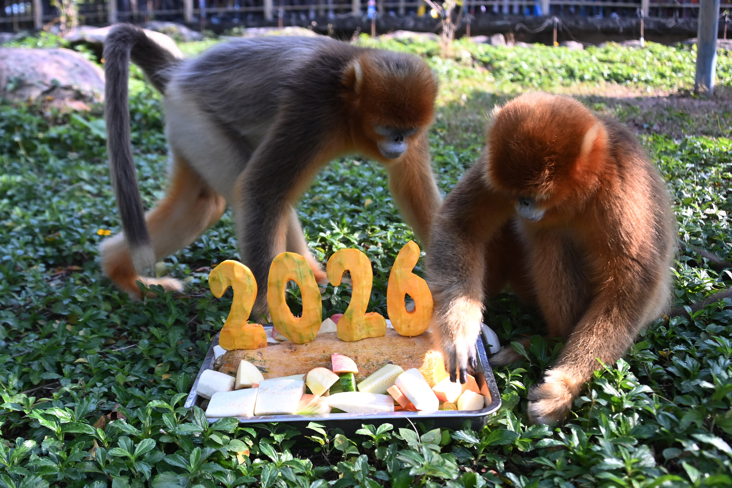 金丝猴岛上,还没等饲养员放下“美食拼盘”,金丝猴便纷纷从树上跳下。它们对新奇的摆盘充满好奇,和睦围坐,各自挑选喜爱的食物,共享新年美食。